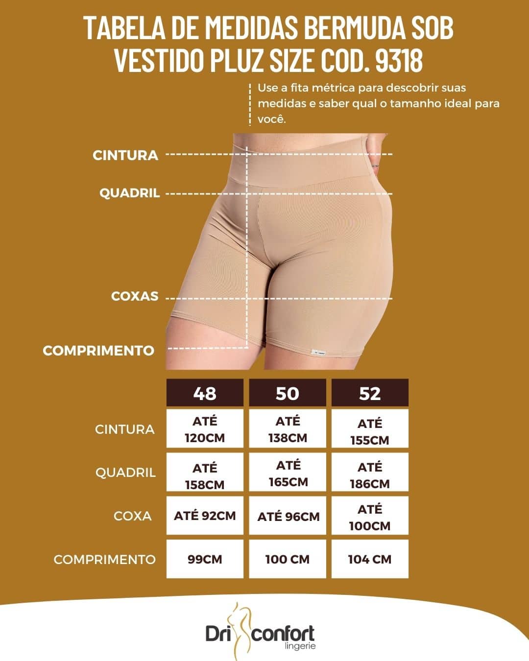Lateral ampla, cós duplo, cintura alta e pernas compridas, ideal para diminuir o atrito entre as pernas.